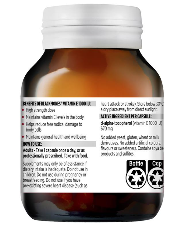 - Blackmores Natural Vitamin E 1000IU là nguồn cung cấp vitamin E tự nhiên hỗ trợ bảo vệ cơ thể khỏi tác hại của tuổi tác