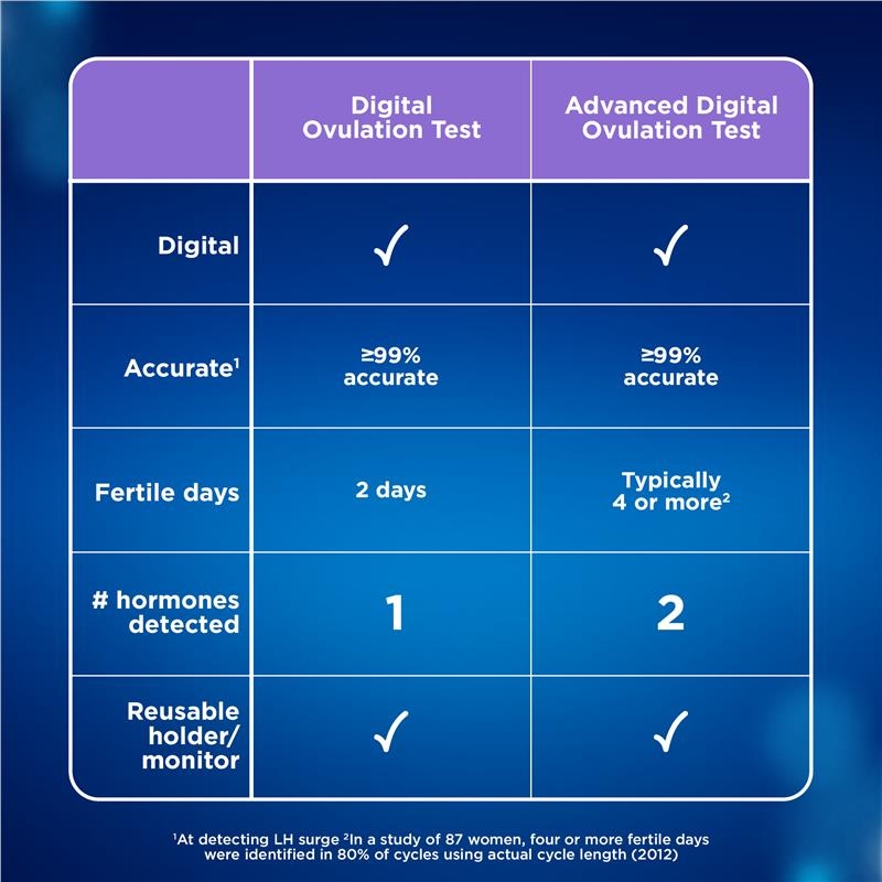 • Độ chính xác trên 99% trong việc phát hiện sự gia tăng hormone hoàng thể (LH). Hormone là yếu tố dự đoán rụng trứng chính xác hơn nhiệt độ cơ thể cơ bản (BBT), chỉ tăng sau khi rụng trứng