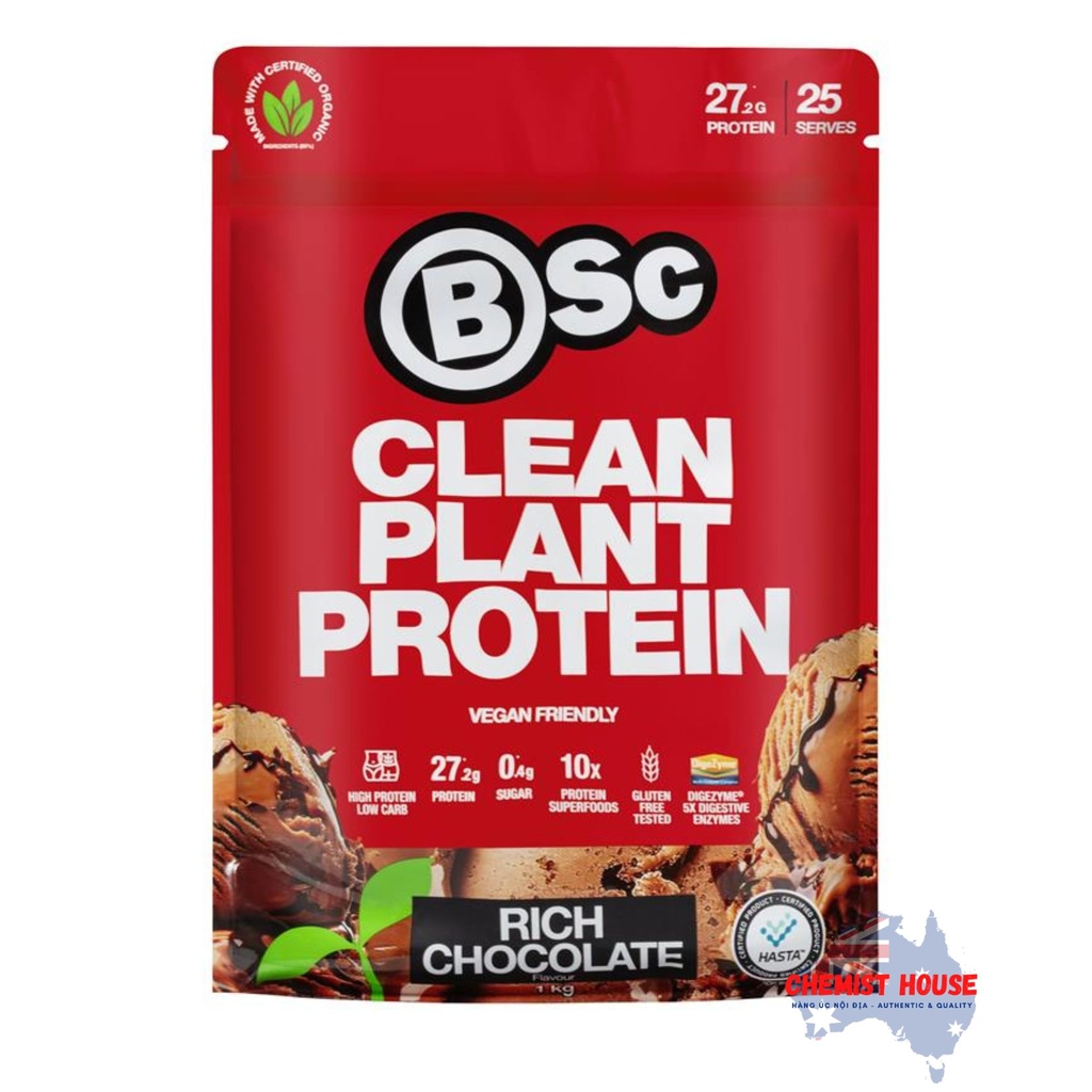 - BSc Clean Plant Protein Rich Chocolate chứa đầy đủ protein thực vật hữu cơ được chứng nhận (chính xác là 10 nguồn khác nhau), với hơn 30g protein và ít hơn 5g carbohydrate trên mỗi khẩu phần, loại protein có hương vị thơm ngon này được làm từ 100% thành phần thực phẩm thật. Thêm vào đó, nó thân thiện với người ăn chay.