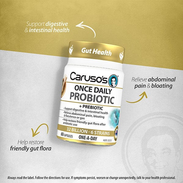 Caruso's Once Daily Probiotic là thực phẩm bổ sung men vi sinh dùng một lần mỗi ngày, cung cấp một lượng lớn 32 tỷ vi khuẩn tốt cộng với chất xơ prebiotic trong mỗi viên nang.