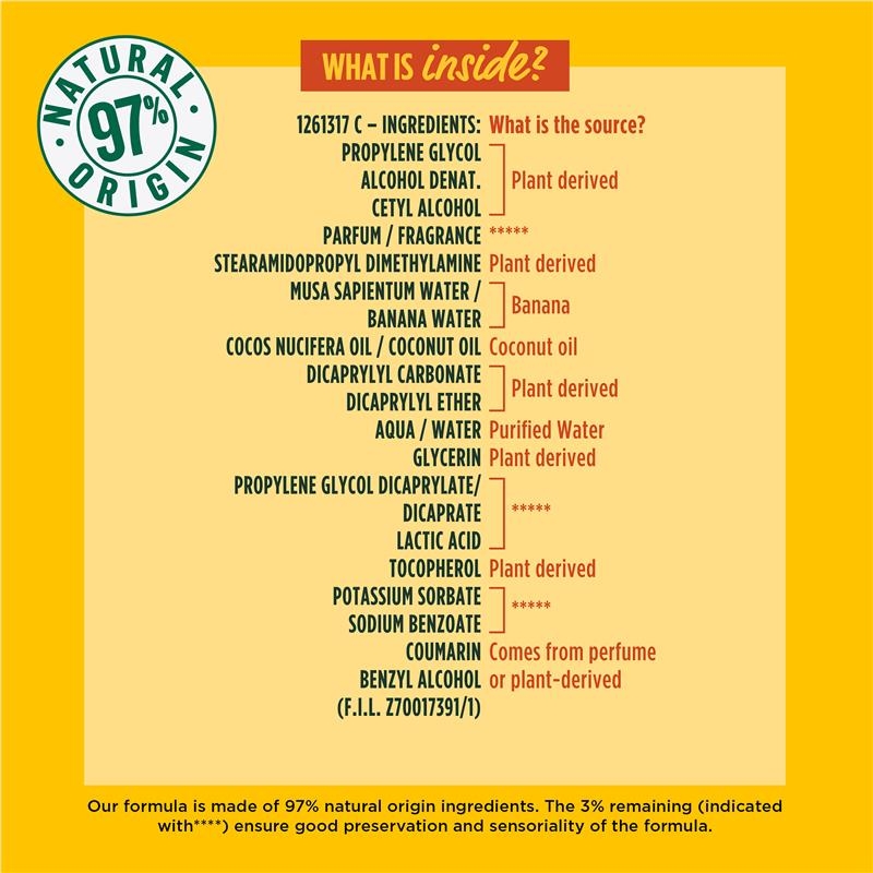 PROPYLENE GLYCOL, ALCOHOL DENAT., CETYL ALCOHOL, PARFUM / FRAGRANCE, STEARAMIDOPROPYL DIMETHYLAMINE, NƯỚC MUSA SAPIENTUM / NƯỚC CHUỐI, DẦU COCOS NUCIFERA / DẦU DỪA, DICAPRYLYL CARBONATE, DICAPRYLYL ETHER, AQUA / NƯỚC, GLYCERIN, PROPYLENE GLYCOL DICAPRYLATE/DICAPRATE, AXIT LACTIC, TOCOPHEROL, KALI SORBATE, NATRI BENZOATE, COUMARIN, BENZYL ALCOHOL (F.I.L. Z70017391/1)