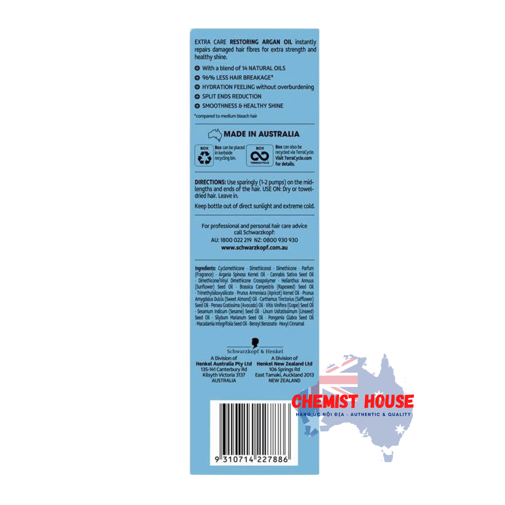 Tuyên bố về sản phẩm: Với sự pha trộn của 14 loại dầu tự nhiên - Giảm 96% tình trạng gãy tóc* - Cảm giác dưỡng ẩm mà không gây quá tải - Giảm chẻ ngọn - Mềm mượt và bóng khỏe - Sản xuất tại Úc - Chai được làm bằng 100% nhựa tái chế *So với tóc tẩy trung bình"