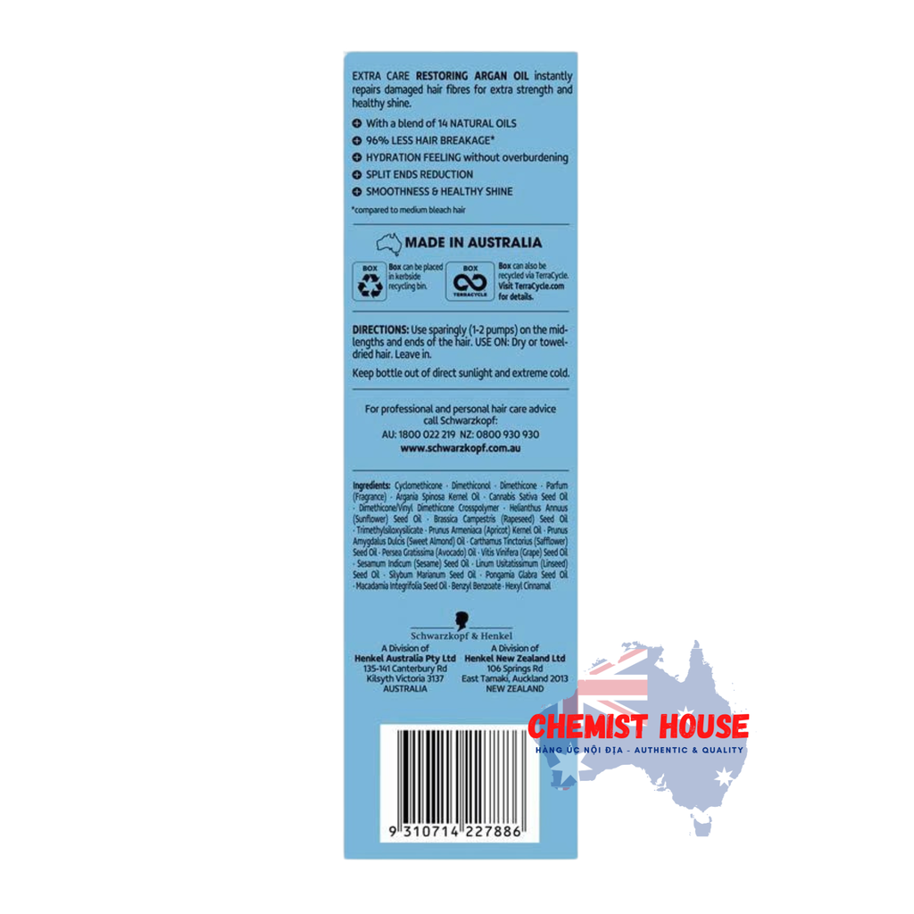 Dầu Argan phục hồi Extra Care của Schwarzkopf với hỗn hợp 14 loại dầu tự nhiên giúp phục hồi ngay lập tức các sợi tóc hư tổn để có thêm sức mạnh và độ bóng khỏe mạnh.