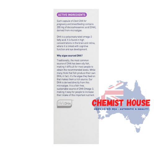 - Viên bổ sung DHA Elevit dành cho phụ nữ mang thai và cho con bú được chiết xuất từ vi tảo. Nguồn nguyên liệu an toàn được kiểm định nghiêm ngặt và xử lý mọi tạp chất.