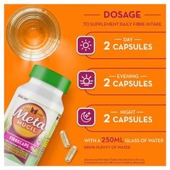 - Lành mạnh và tiện lợi Với Metamucil Fibrecaps, bạn sẽ nhận được lợi ích từ 100% chất xơ psyllium tự nhiên. Uống mỗi liều với một cốc nước 250 ml. Uống nhiều nước. Nuốt 1 viên nang mỗi lần và uống ở tư thế thẳng đứng.