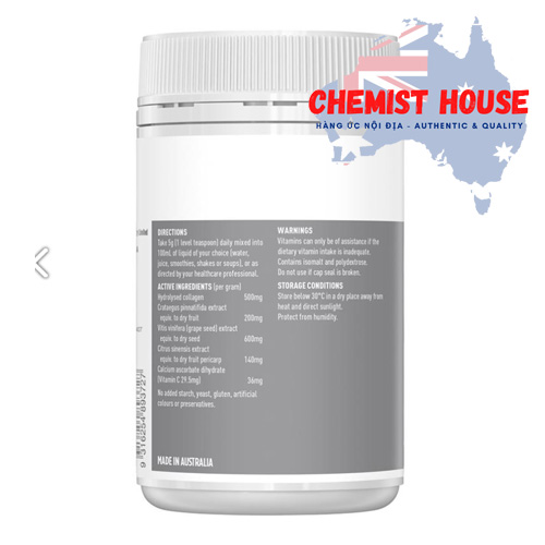 Thành phần Thành phần hoạt tính: Mỗi gam: Collagen thủy phân 500 mg Chiết xuất Crataegus Pinnatifida trái cây khô 200 mg Vitis Vinifera (hạt nho) Chiết xuất hạt khô 600 mg Chiết xuất Citrus Sinensis để khô trái cây pericarp 140 mg Canxi Ascorbate Dihydrate (Vitamin C 29,5 mg) 36 mg Chứa: Vitamin chỉ có thể được hỗ trợ nếu lượng vitamin trong chế độ ăn uống không đủ. Chứa isomalt và polydextrose. Không sử dụng nếu con dấu nắp bị hỏng. Hướng dẫn sử dụng: Lấy 5 g (1 muỗng cà phê mức độ) mỗi ngày pha vào 100mL chất lỏng mà bạn chọn (nước, nước trái cây, sinh tố, đồ lắc và súp), hoặc theo chỉ dẫn của chuyên gia chăm sóc sức khỏe của bạn.