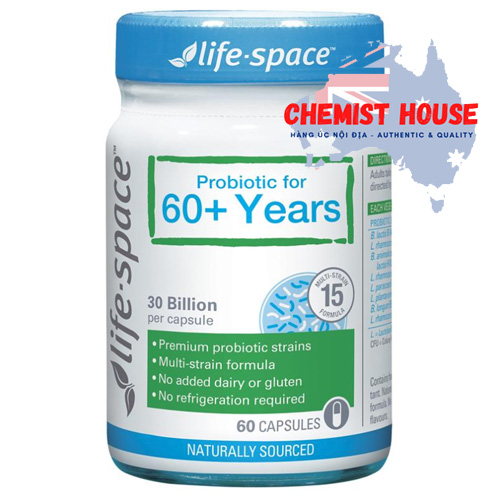 - Life Space Probiotic For 60+ Years 60 Capsules là công thức được phát triển dựa theo công thức của Danisco (Đan Mạch) hỗ trợ cung cấp các chủng vi sinh probiotic có lợi cho hệ tiêu hóa người lớn trên 60 tuổi giúp họ tiêu hóa tốt hơn, hạn chế tình trạng đầy bụng, khó tiêu và các bệnh về đường ruột.