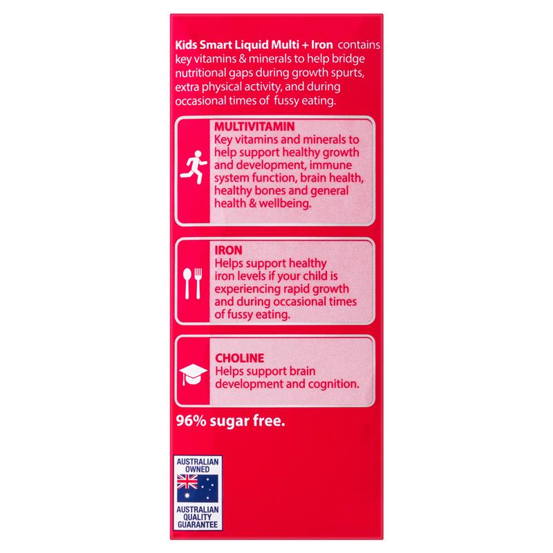 - Não bộ của trẻ phát triển và lớn lên mỗi ngày. Kids Smart Liquid Multi+Iron được bào chế đặc biệt với choline và sắt bổ sung để hỗ trợ sự phát triển não bộ khỏe mạnh và chức năng nhận thức khi chế độ ăn uống không đủ.