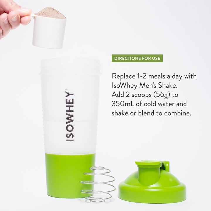 Thay thế 1-2 bữa ăn một ngày bằng IsoWhey Men's Shake. Thêm 2 muỗng (56g) IsoWhey Men's Shake vào 350mL nước lạnh và lắc hoặc xay để trộn đều.