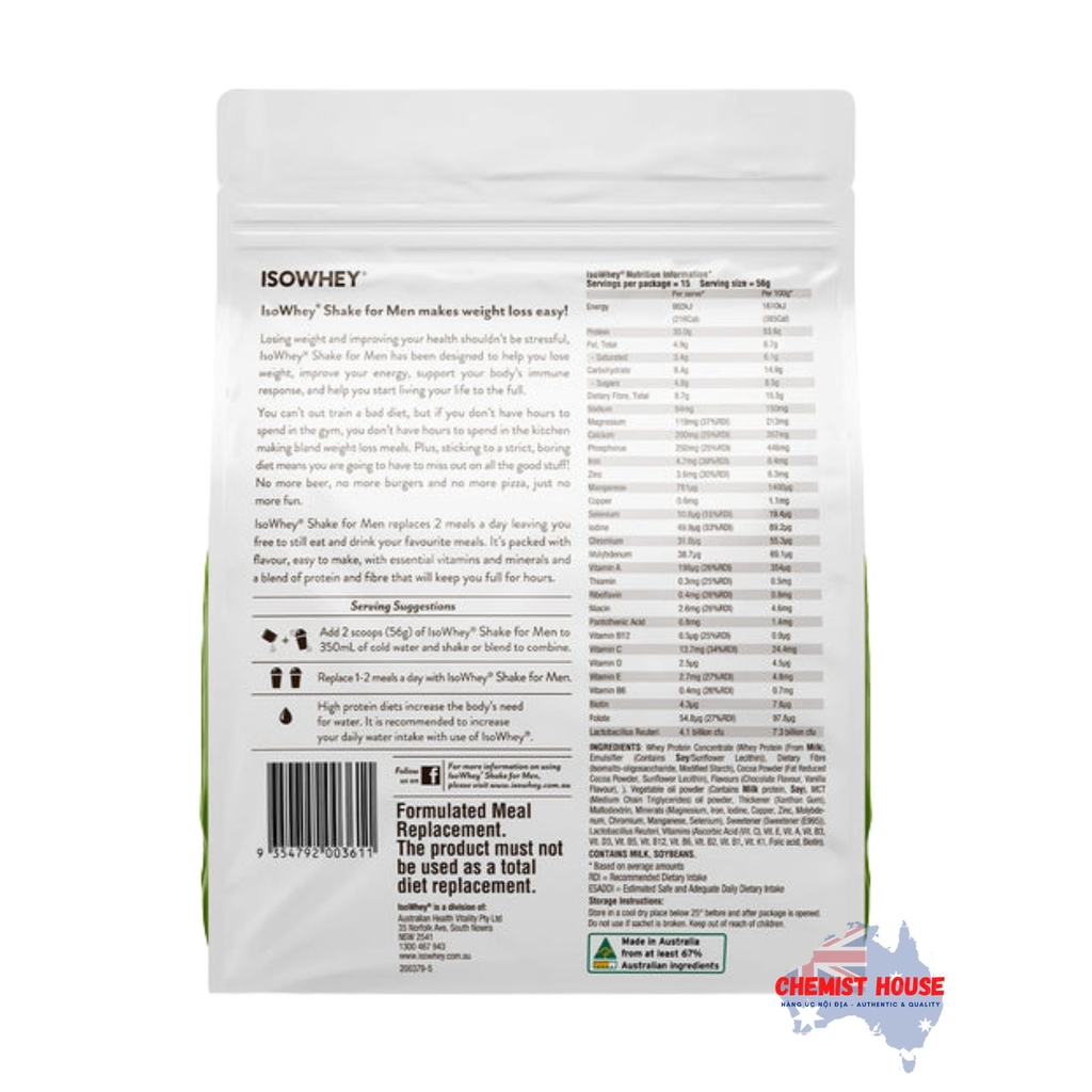 - Giảm cân không nhất thiết phải khó, không nhất thiết phải dành nhiều giờ trong phòng tập, những bữa ăn nhạt nhẽo vô vị và cái chết của cuộc sống xã hội của bạn. Chúng tôi đã đóng gói mỗi IsoWhey Men's Shake với 30g Whey Protein nguyên chất của Úc, chất xơ và các loại vitamin và khoáng chất thiết yếu để cung cấp cho bạn một bữa ăn hoàn chỉnh, dễ chế biến và thỏa mãn khi dùng.