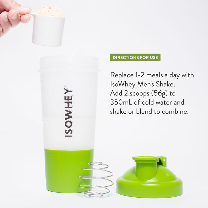 - Thay thế 1-2 bữa ăn một ngày bằng IsoWhey Men's Shake. Thêm 2 muỗng (56g) IsoWhey Men's Shake vào 350mL nước lạnh và lắc hoặc xay để trộn đều.