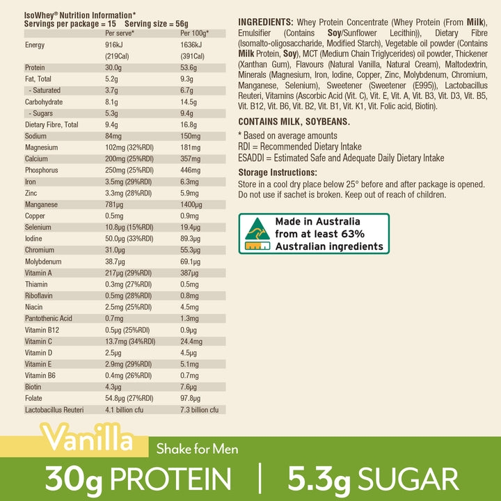 - Giảm cân không nhất thiết phải khó, không nhất thiết phải dành nhiều giờ trong phòng tập, những bữa ăn nhạt nhẽo vô vị và cái chết của cuộc sống xã hội của bạn. Chúng tôi đã đóng gói mỗi IsoWhey Men's Shake với 30g Whey Protein nguyên chất của Úc, chất xơ và các loại vitamin và khoáng chất thiết yếu để cung cấp cho bạn một bữa ăn hoàn chỉnh, dễ chế biến và thỏa mãn khi dùng.