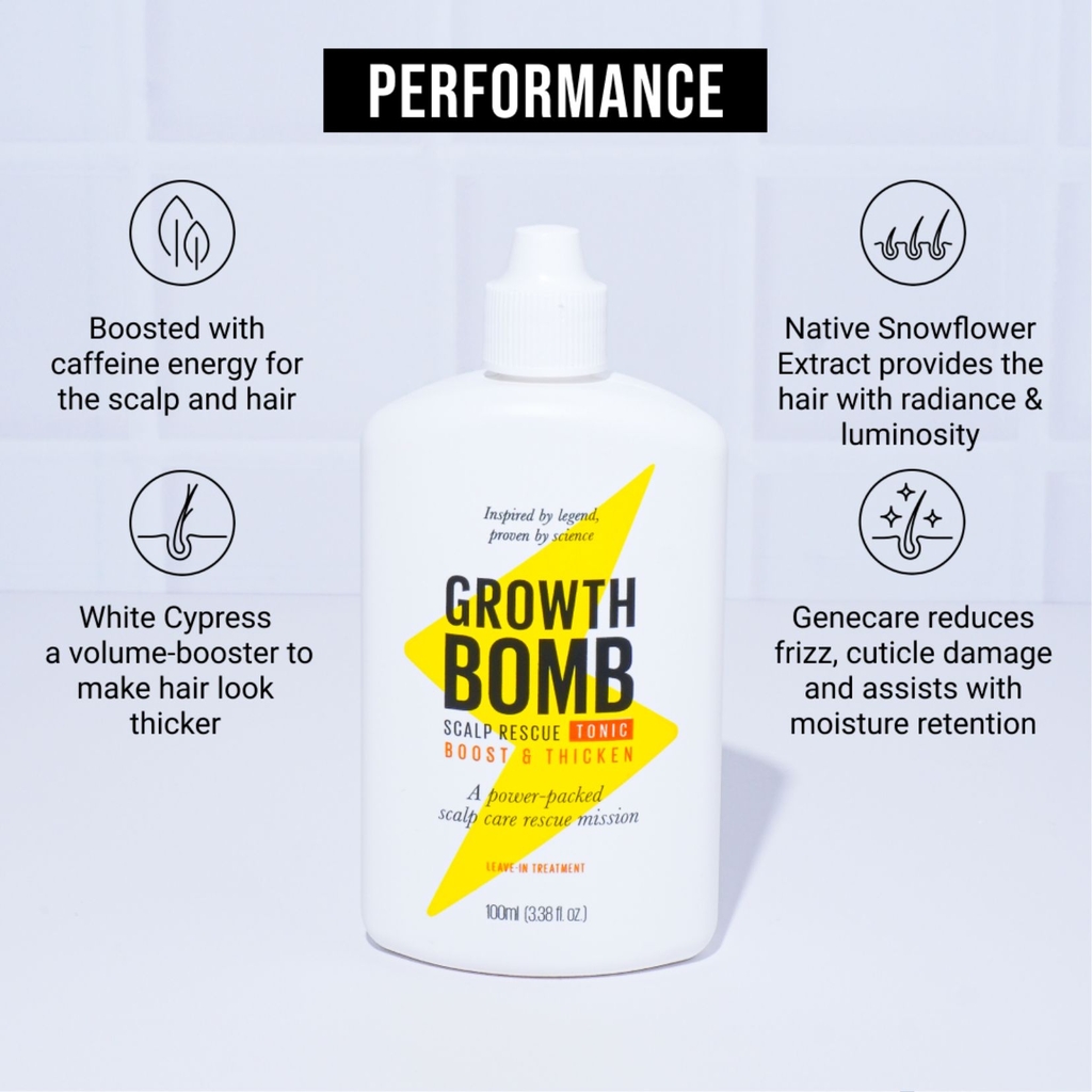 - Thoa trực tiếp 2-3 giọt lên các vùng chính trên da đầu. Nhẹ nhàng massage để hấp thụ tối đa. Sử dụng với toàn bộ dòng sản phẩm bombin' của Growth Bomb để có kết quả tối ưu.