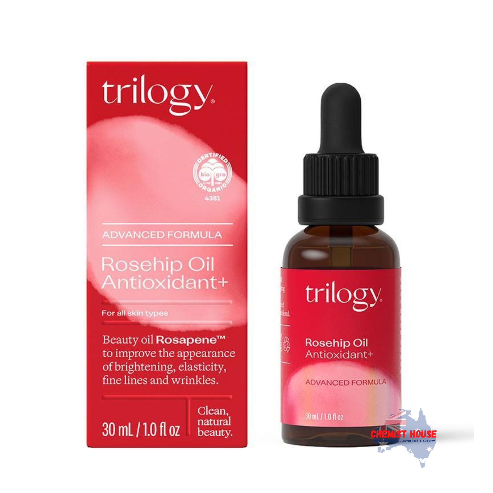 Rosapene ™: Hỗn hợp axit béo thiết yếu độc đáo của Trilogy và dầu hạt chứa chất chống oxy hóa của dầu hạt tầm xuân, cà chua, nam việt quất và acai để nuôi dưỡng, bổ sung và dưỡng ẩm tuyệt vời cho da.