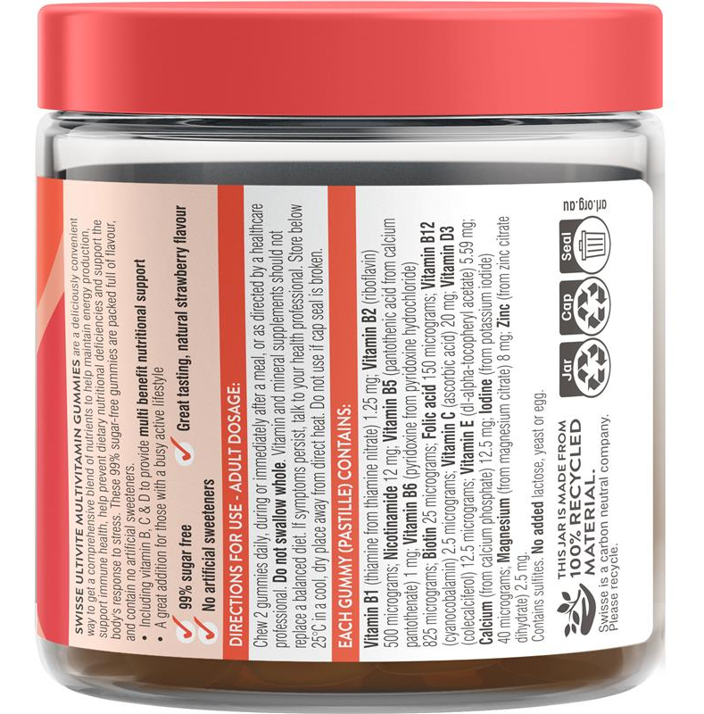 Hỗ trợ lượng dinh dưỡng của bạn với Swisse Ultivite Multivitamin Gummies. Những loại kẹo dẻo ngon và tiện lợi này duy trì sản xuất năng lượng, hỗ trợ sức khỏe miễn dịch, giúp ngăn ngừa sự thiếu hụt chất dinh dưỡng trong chế độ ăn uống và hỗ trợ phản ứng căng thẳng lành mạnh trong cơ thể.