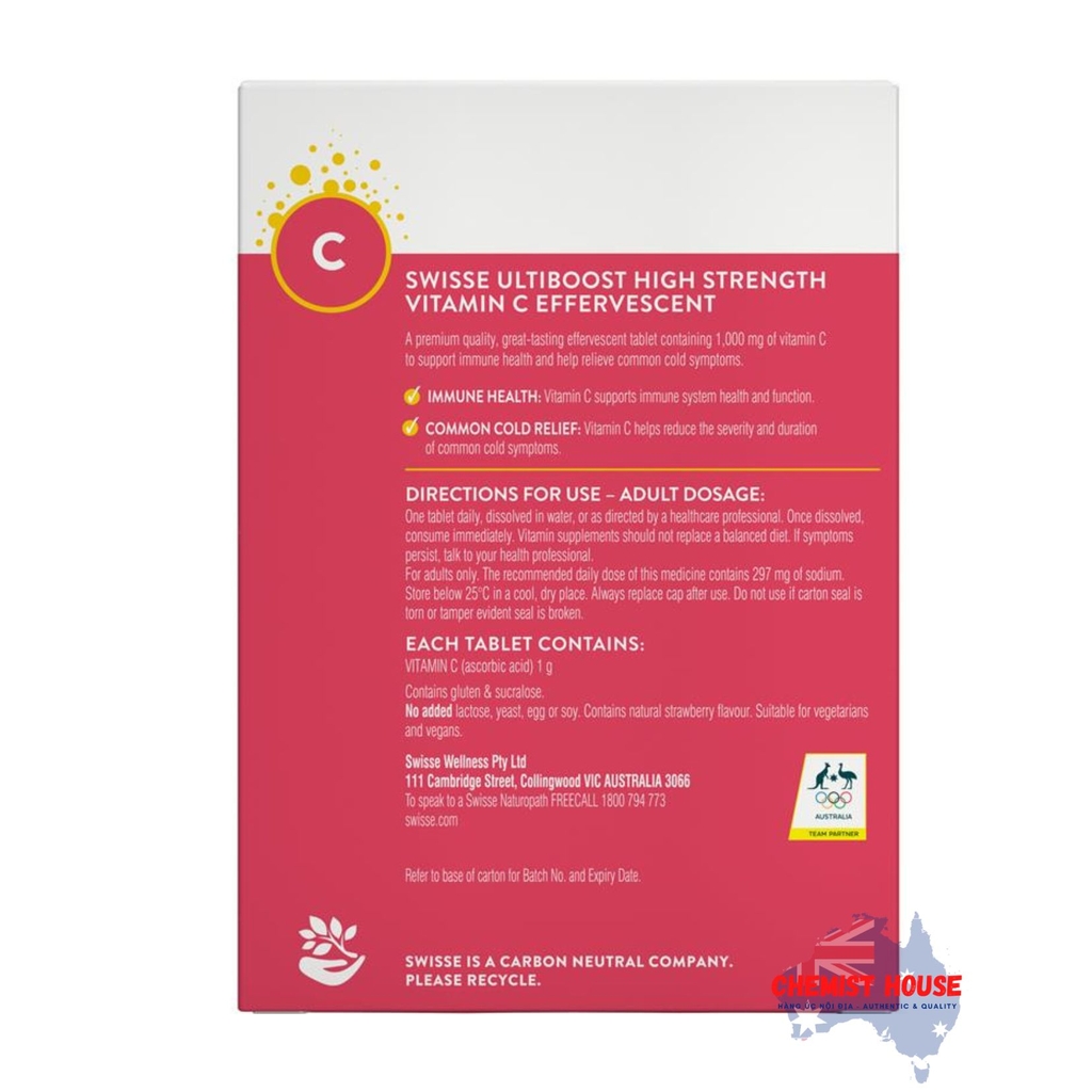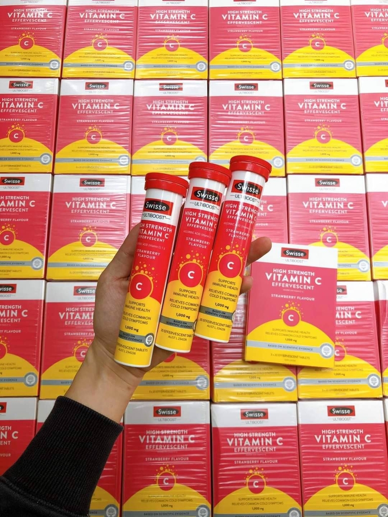 Swisse High Strength Vitamin C Effervescent là một viên sủi bọt có hương vị tuyệt vời, chất lượng cao, hỗ trợ sức khỏe miễn dịch và giúp giảm các triệu chứng cảm lạnh thông thường, chẳng hạn như nghẹt mũi hoặc ho khan. Nó được pha chế với 1.000 mg vitamin C và có hương vị dâu tây tự nhiên. Loại sủi bọt thú vị này cung cấp một sự thay thế thuận tiện cho viên nén hoặc viên nang.