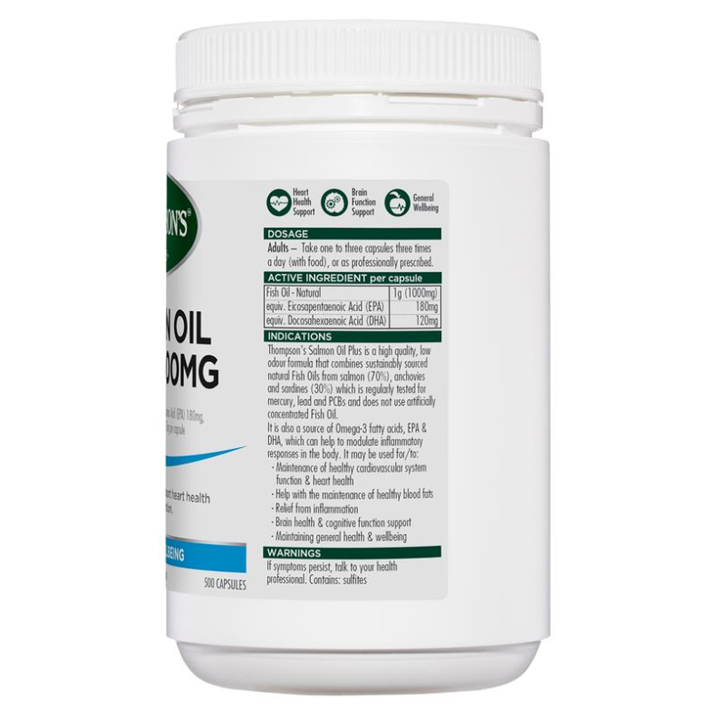 Dầu cá hồi của Thompson giúp hỗ trợ sức khỏe tim mạch, chức năng não và sức khỏe nói chung. Đó là một công thức hồi lưu thấp kết hợp Dầu cá tự nhiên từ cá hồi (70%), với Dầu cá tự nhiên từ cá cơm và cá mòi (30%) để cung cấp hàm lượng EPA / DHA cao. Nó là một nguồn axit béo Omega-3 phong phú, các axit béo thiết yếu cần thiết cho cơ thể để giúp hỗ trợ phản ứng viêm. Dầu cá hồi của Thompson là một sản phẩm chất lượng cao, không sử dụng Dầu cá cô đặc nhân tạo và chỉ chứa cá có nguồn gốc bền vững. Dầu cá trong Salmon Oil Plus thường xuyên được kiểm tra thủy ngân, chì và PCB.