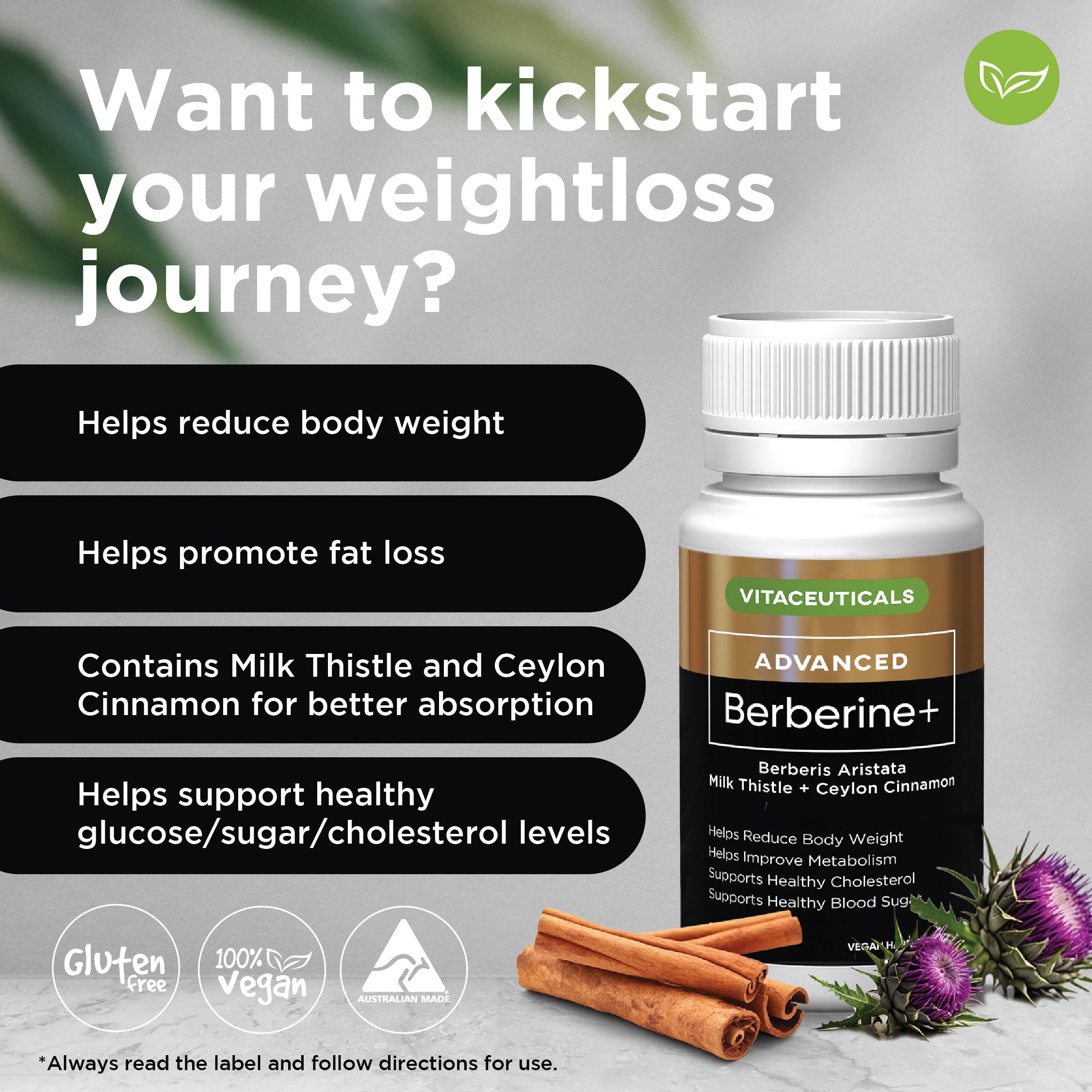 - Berberine+ kết hợp Berberis Aristata với Ceylon Cinnamon và Milk Thistle để cung cấp một công thức tất cả trong một giúp giảm cân và thúc đẩy giảm mỡ khi sử dụng kết hợp với tăng cường hoạt động thể chất và giảm lượng calo nạp vào.