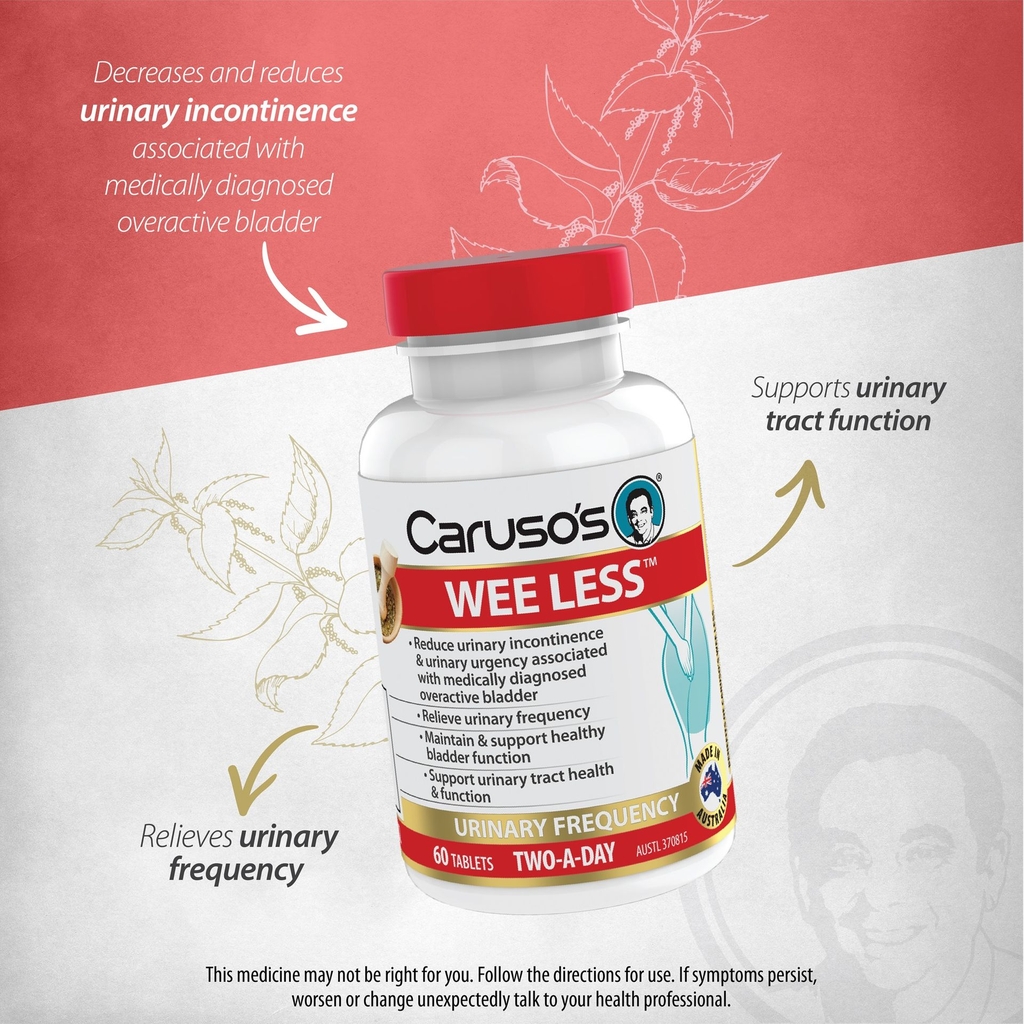 Caruso’s WEE LESS là một công thức thảo dược độc đáo được thiết kế để giảm tiểu không kiểm soát và tiểu gấp liên quan đến bàng quang hoạt động quá mức được chẩn đoán về mặt y tế.