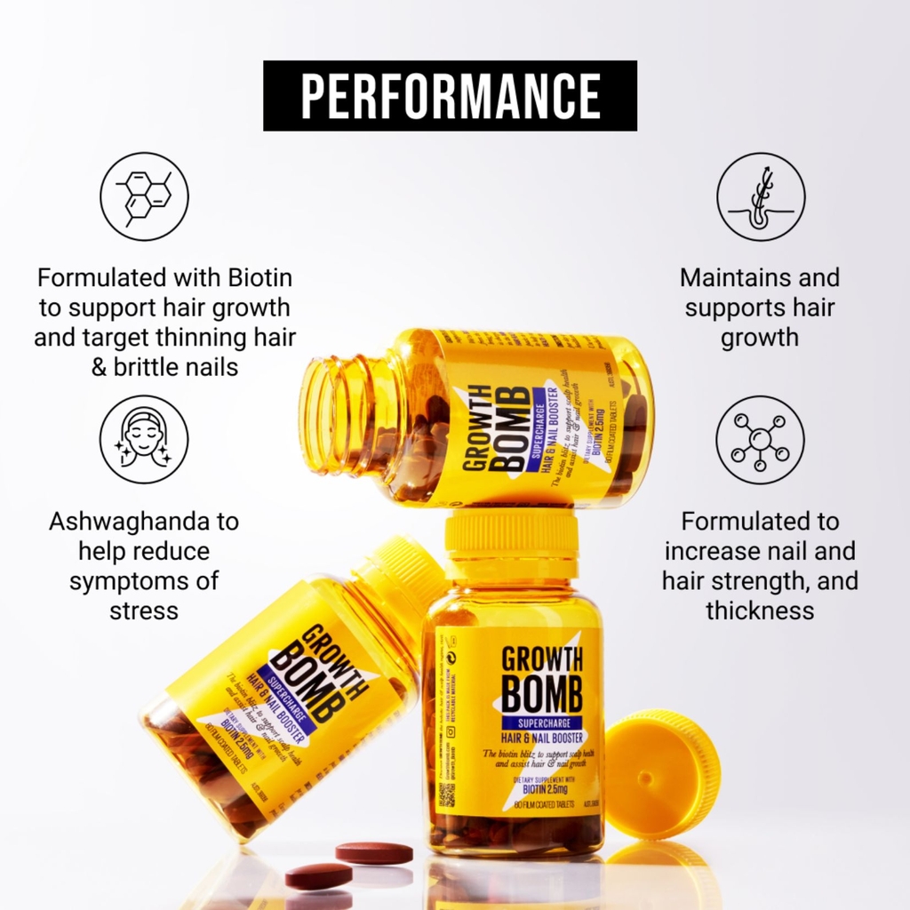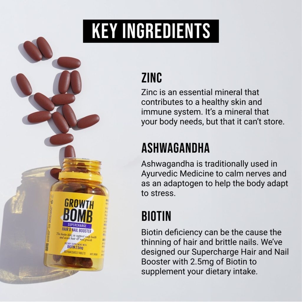 - Chúng tôi đã tạo ra hỗn hợp các thành phần SUPERCHARGE này để hỗ trợ MỤC TIÊU VỀ TÓC VÀ MÓNG TAY của bạn. TÓC VÀ MÓNG TAY BOOSTER của chúng tôi được bào chế với ASHWAGANDHA tự nhiên, giàu AXIT AMINO CYSTEINE và BIOTIN hỗ trợ TÓC KHỎE MẠNH, DÀY HƠN VÀ MÓNG TAY CHẮC HƠN. Công thức này chứa RDI KẼM, I-ốt & CANXI để hỗ trợ TÓC DÀY HƠN VÀ SỨC KHỎE MÓNG TAY. Được thiết kế để thúc đẩy sự phát triển của tóc và cải thiện sức khỏe của móng; công thức độc đáo của chúng tôi chứa Biotin, Ashwagandha, Kẽm, Iốt và Canxi. Growth Bomb Supercharge Hair & Nails là vũ khí bí mật của bạn để hỗ trợ móng dày và mái tóc khỏe mạnh.